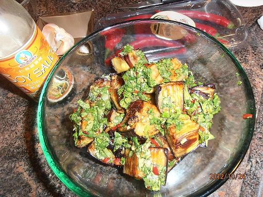 Особенности: питание по Монтиньяку. 2 средних баклажана нарезать кубиками 2,5 см, обжарить в растительном масле до зарумянивания со всех сторон, выложить на бумажное полотенце для удаления излишков масла. Для соуса смешать 3 ст.л. мёда 2 ст.л. соевого соуса 1/3 стакана мелко нарезаной зелени кинзы 1 ч.л. молотых зёрен кинзы 2 растолчёных зубочка чеснока 1 мелко нарез. острый перчик Все ингридиенты для соуса смешать и добавить кубики баклажан. Перемешать и оставить на некоторое время для впитывания соуса баклажанами и смешивания вкусов.