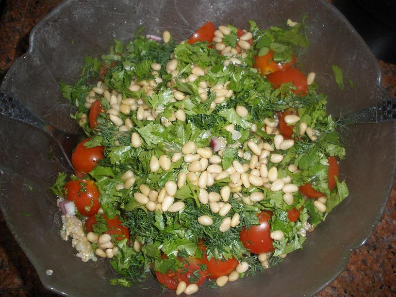 Салаты Салат с киноа Особенности: Отношение к вегетарианству: Вегетарианское блюдо, годится беременным, низкокалорийно, питание по Монтиньяку. Киноа хорошо промыть (иначе будет горький привкус), залить водой (1 часть киноа, 2 части воды), посолить, варить на медленном огне при закрытой крышке до полного испарения жидкости (примерно 25 минут).Остудить и использовать как основу салата.Приготовление салата : киноа, мелко порезать красный лук , лимон, масло оливковое, соль,перец. Затем шерри половинки, мята, кинза,укроп, вяленая клюква и кедровые орешки. Ингредиенты: киноа 5 стол.ложка, шерри 15 шт., лук репка 0,5 шт., Автор рецепта: Olga Kholodova. Общие особенности приготовления