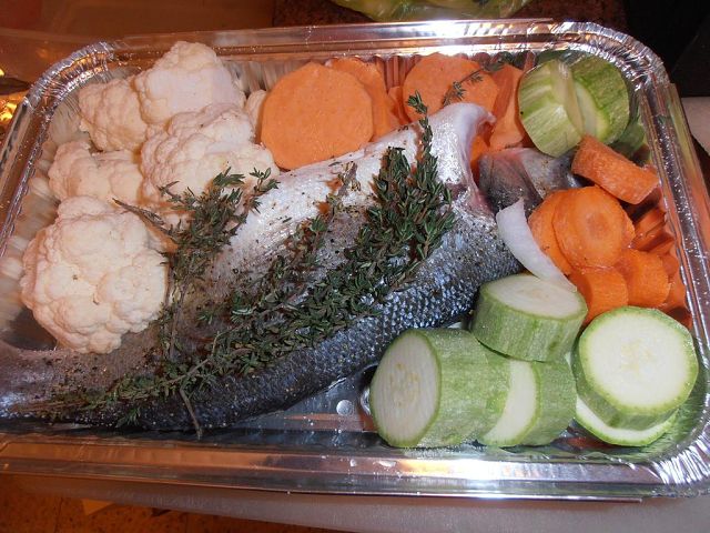 Особенности: подходит детям, годится беременным, низкокалорийно, питание по Монтиньяку. Рыбу лаврак замариновать на 20 минут солью, перцем, лимонным соком. В форму, смазанную оливковым маслом выложить рыбу, батат, кабачки, морковь, цветную капусту , добавить веточку тимьяна. Закрыть фольгой, запекать в духовке 30-40 минут. Ингредиенты: лаврак 1 шт., капуста цветная 300 грамм, батат 1 шт., Автор рецепта: Olga Kholodova. Общие особенности приготовления