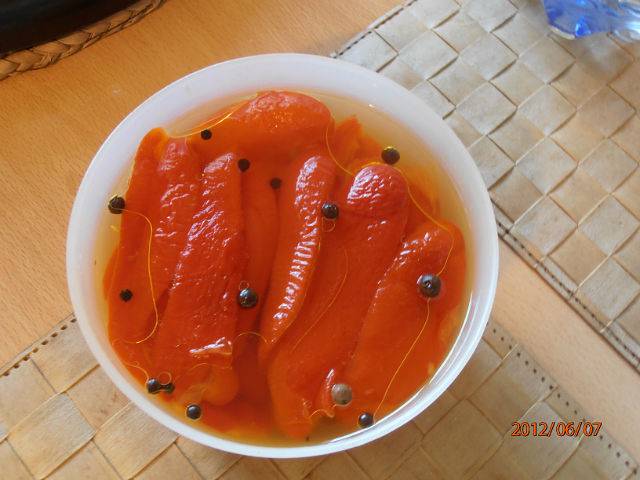 Особенности: Отношение к вегетарианству: Вегетарианское блюдо, годится беременным, питание по Монтиньяку. Перцы запечь в духовке, очистить от кожицы и семян, залить маринадом : полстакана холодной кипяченой воды, 3 стол.ложки уксуса,3 стол.ложки оливк.масла, 2-3 зубчика чеснока, перец черный, перец душистый, 1 чайная ложка соли,1 чайная ложка сахара.Залить на сутки, затем убрать в холодильник. Ингредиенты: перец болгарский 4 шт., масло оливковое 3 стол.ложка, уксус 3 стол.ложка, Автор рецепта: Olga Kholodova. Общие особенности приготовления