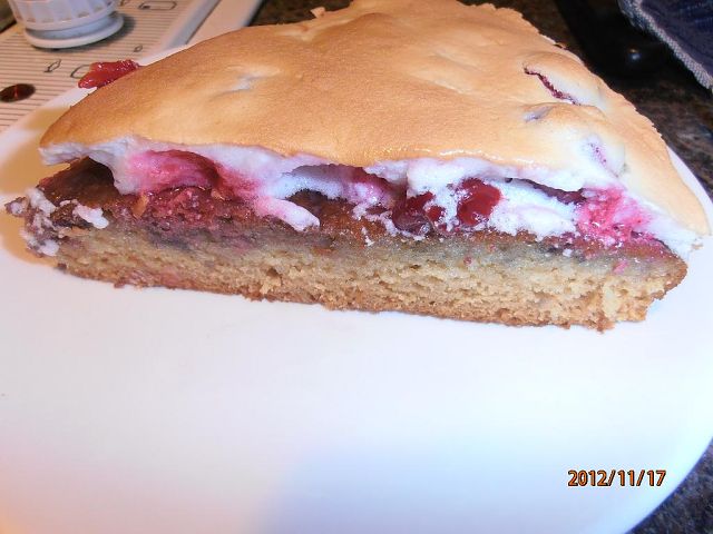 Особенности: Отношение к вегетарианству: Вегетарианское блюдо, подходит детям, годится беременным. Бисквит - 1 яйцо,3/4 стакана сахара,200 гр сметаны,0,5ч.л.соды, 1 стакан муки. Все постепенно взбила и выпекала 15 минут в горячей духовке 180гр. На готовый бисквит выложить вишни и сверху взбитые белки ( у меня 2 белка и 0,5 стакана сахара). Еше запечь - примерно 5 минут. Ингредиенты: яйца 1 шт., сахар 1,2 стакан, сметана 200 грамм, Автор рецепта: Olga Kholodova.
