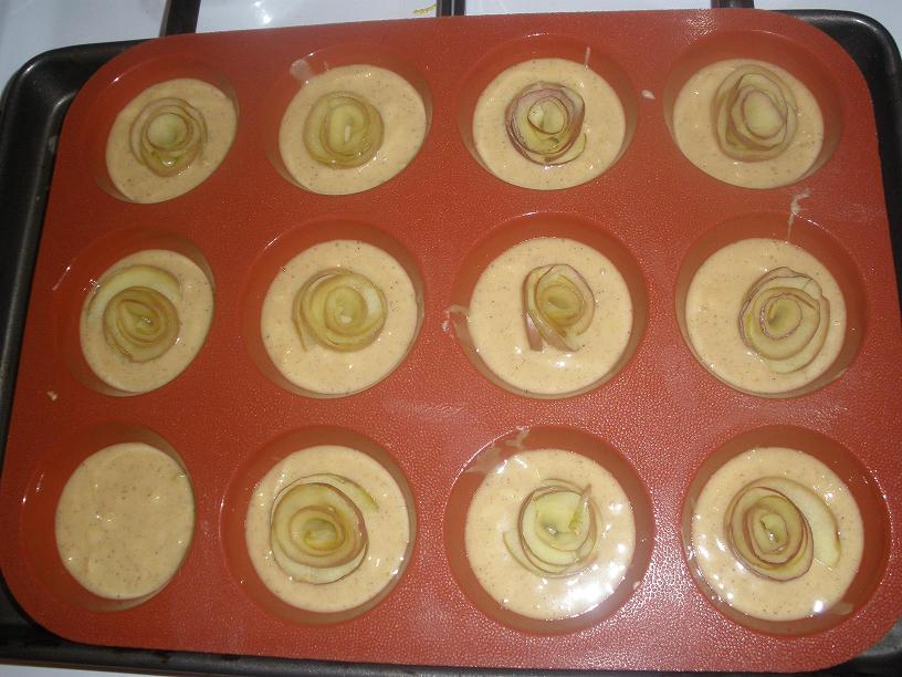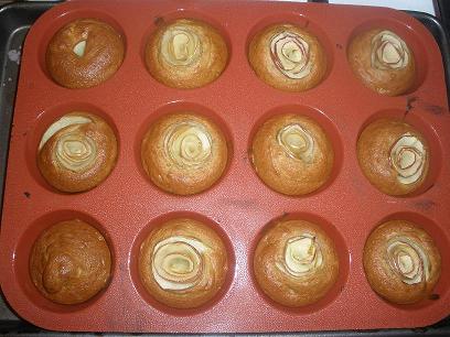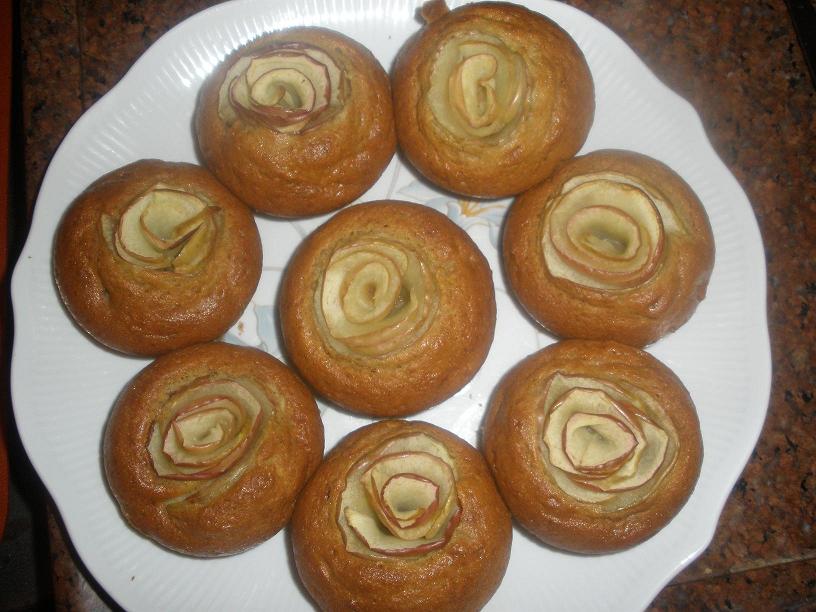Выпечка Маффины с яблоками Особенности: подходит детям, годится беременным. Яблоки очистить, одно натереть на крупной тёрке, второе мелко порезать. По желанию можно оба потереть или взять одно яблоко. Муку смешать с разрыхлителем. Яйца взбить с сахаром и ванилином. Смешать обе массы, добавить молоко, раст. масло и вмешать яблоки.Если тесто покажется жидким, добавить ещё немного муки. Тесто распределить по формочкам и выпекать в предварительно нагретой духовке 20-25минут при Т 180 гр. Для украшения- яблоки порезала пополам и нарезала из половинок очень тонкие ломтики. Выложила их на тарелку и поставила в микроволновку на 1,5 минуты, для размягчения. Можно отварить в сиропе, тоже 1,5-2минуты. Из остывших ломтиков сделала розочки и поставила сверху на тесто, а потом поставила в духовку.