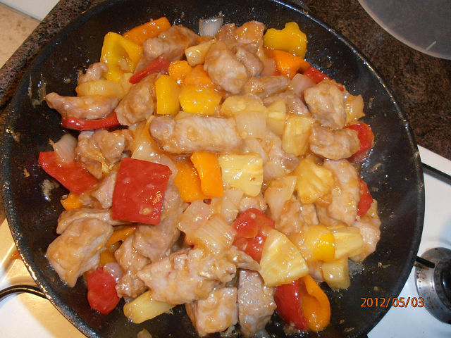 Особенности: питание по Монтиньяку. Рецепт : маринуем мясо - свинину нарезать небольшими кубиками и перемешать с 1/4 стол.лож.соли. добавляем в мясо и премешиваем сразу - 2 стол,ложки вина (не обязательно),1 стол лож соевого соуса, 1 яичный белок, 2 стол.л.крахмала - оставляем на 30 минут при комнатной температуре. В это время режем кубиками 1 луковицу и 2 перца красный и желтый. готовим соус -3 стол.лож.сахара, 3 стол.лож.уксуса, 1 стол. лож.имбиря (я брала свежий в терку), 1 стол.лож.кетчупа . отдельно развести 2 стол. ложки крахмала водой. Процесс: В сковороде в большом кол-ве масла растит. жарим мясо- выкладываем по 1 кусочку и жарим 1-1,5 минуты до золотистого цвета- дольше жарить не надо- будет жестким, и выкладываем на тарелку,получается быстро жарить по несколько кусочков. затем сливаем масло, оставляем 3 ложки,добавляем в него дольку чеснока, нарезанный квадратиками лук - обжариваем до мягкости, закладываем порезанные 2 перца ,перемешиваем, вливаем приготовленный соус, перемешиваем, жарим 2-3 минуты, добавляем обжаренное мясо-перемешиваем и вливаем приготовленный крахмал , перемешиваем и жарим до загустения соуса. добавить ананасы (не переборщить). Все время подготовки и приготовления блюда 40 минут Ингредиенты: мясо - свинина 300 грамм, соевый соус 1 стол.ложка, яичный белок 1 шт., Автор рецепта: Olga Kholodova. Общие особенности приготовления
