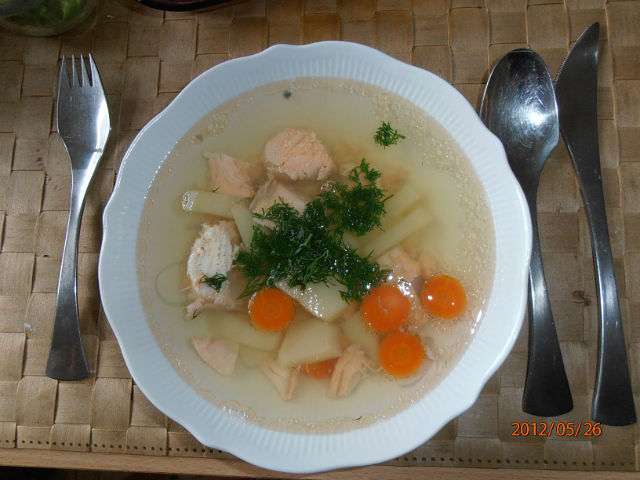 Особенности: подходит детям, годится беременным, питание по Монтиньяку. Лосось (голова и хвостовая часть) почистить, промыть, залить водой, добавить луковицу целиком и морковку и варить на очень медленном огне (1 буль,томить)примерно 1-1,5 часа, пока бульон не станет густым и прозрачным. Пучок петрушки связать ниткой - опустить в бульон на 5 мин, затем вынуть.Заложить картофель и варить до его полной готовности -не прибавляя огня!Заправить перцем, лавровым листом.Солить в середине варки по вкусу.