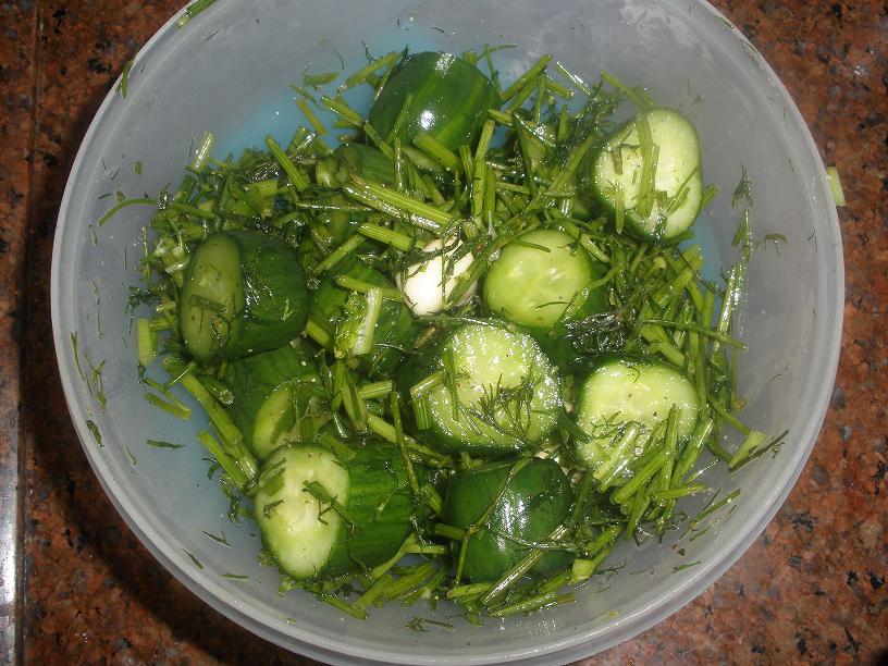 Овощные блюда Малосольные огурцы Особенности: Отношение к вегетарианству: Вегетарианское блюдо, низкокалорийно, питание по Монтиньяку. Огурцы промыть, разрезать на крупные дольки,поместить в герметичную емкость (пластиковую коробку), добавть чеснок, перец горошек, укроп и щепоть соли.Закрыть крышкой и хорошенько потрясти.Убрать в холодильник. Периодически коробку встряхивать. Через 2 часа огурцы готовы! Ингредиенты: огурец свежий 4 шт., укроп 1 пучок, чеснок 3 дольки, Автор рецепта: Olga Kholodova. Общие особенности приготовления